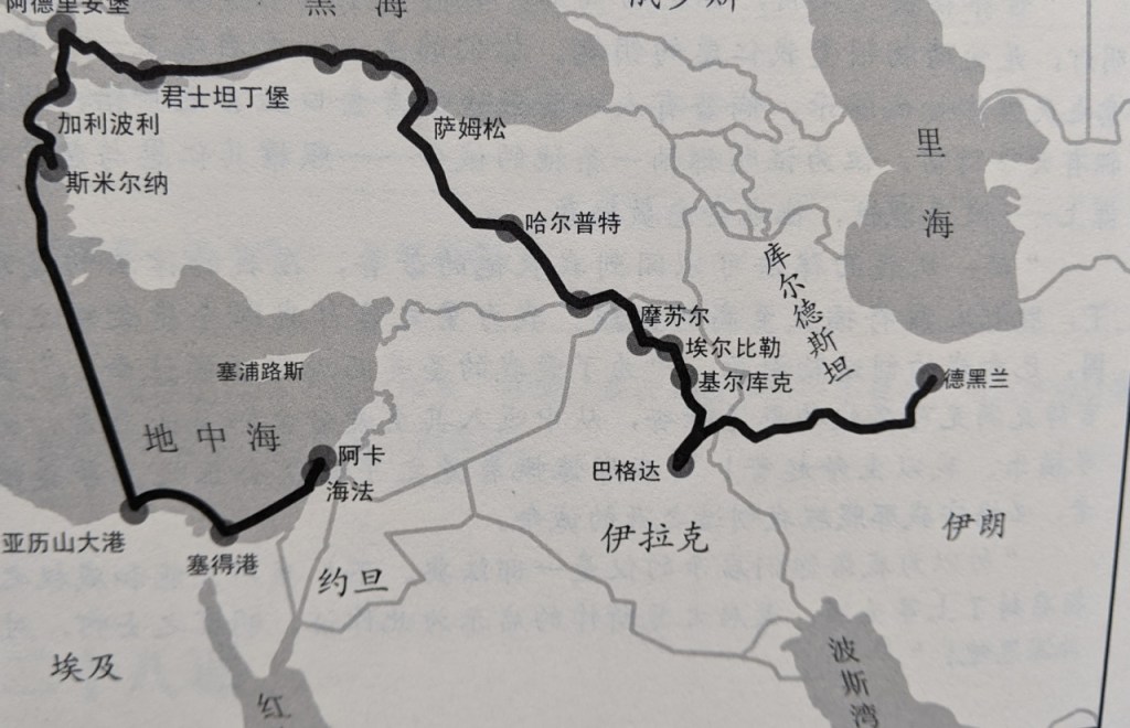 路线起点是东边的伊朗(波斯)首都德黑兰,途径今伊拉克首府巴格达,今土耳其首府伊斯坦布尔(旧称君士坦丁堡)、鄂德纳(旧称阿德里安堡),海路经埃及塞得港,直到阿卡(今以色列境内),时间跨度是四十年(1852-1892);地理上横跨今天的四个国家,但当时都属奥斯曼土耳其帝国版图。