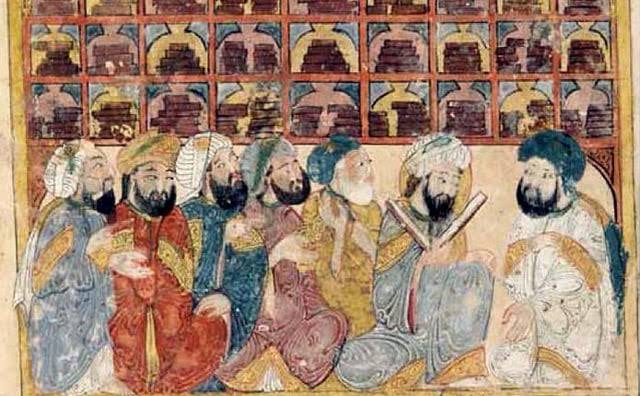 图解:来自欧亚非穆斯林帝国各种宗教、文化、语言、科学背景的男女学者云集智慧宫作学术交流研究。