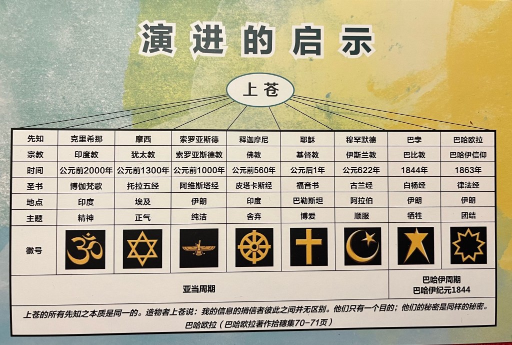 根据图表来源提供者的凯·金企(Kay Zinky)的注解,表中的两大支脉闪族人与雅利安人,分别代表了两个完全不同的人类学分支:闪族人的后代包括北非人、阿拉伯人、犹太人;雅利安人则包括伊朗人与印度人。 因此凯·金企结论道:巴哈欧拉象征性地代表了“西方”和“东方”的宗教,以及它们分别代表的希腊文化(欧洲)与汉族(中华)文化传统的结合。