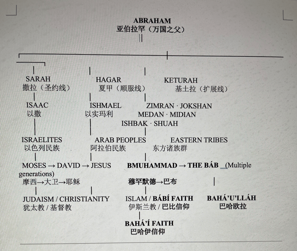 在巴哈伊传统中,巴哈欧拉经由基土拉一支追溯其血统至亚伯拉罕。这一谱系使巴哈伊信仰既属于亚伯拉罕宗教家族,又超越早期血统分化,强调合一而非排他。⁸